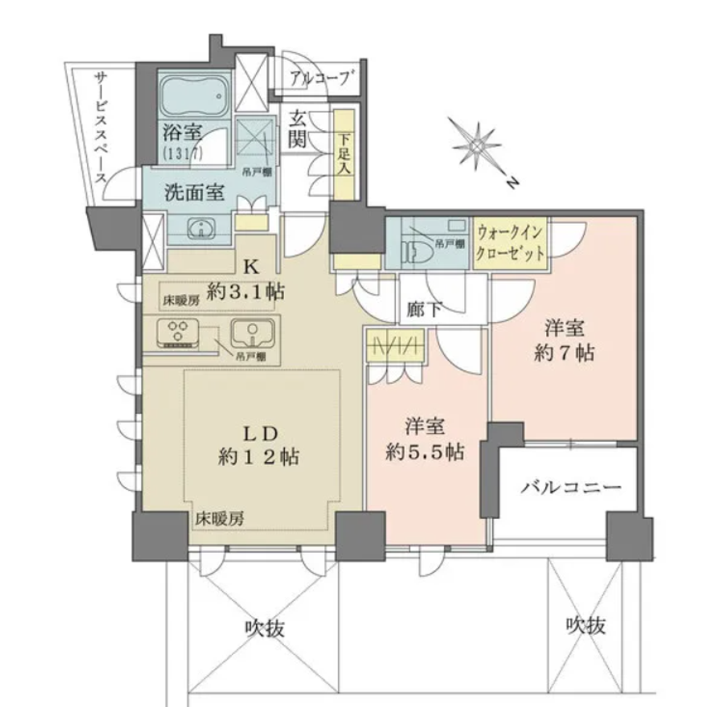 This beautifully appointed corner unit features over 60 square meters of living space with a practical 2LDK layout. The residence benefits from a dual-aspect living and dining area with natural light from two sides, offering a bright and open feel throughout the day. Both the kitchen and the bathroom feature windows, allowing for excellent ventilation and a sense of openness that is rare in central Tokyo properties.